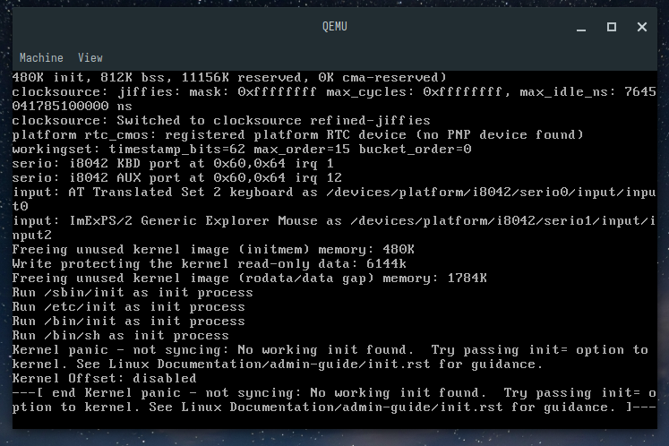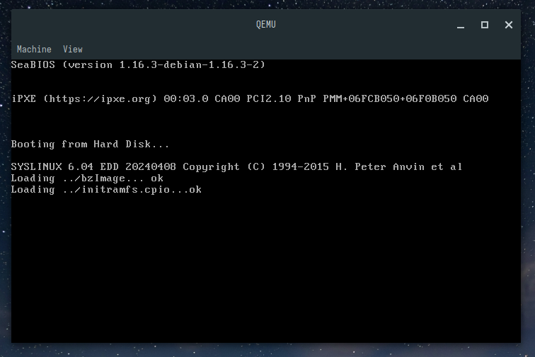Once everything is set up, you should have a bootable image ready to test. When you run the image in QEMU, you should see something like this: